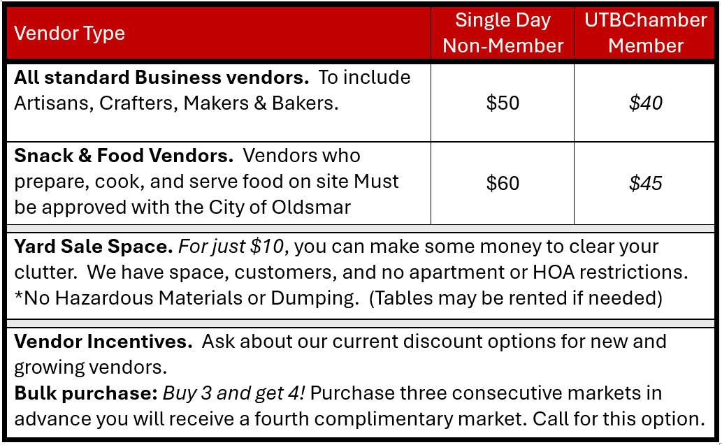 CLICK REGISTER to become a vendor! For the best value, become a member at UTBChamber.com and contact us at 813-855-4233 for bulk, loyalty, and growth incentive pricing.