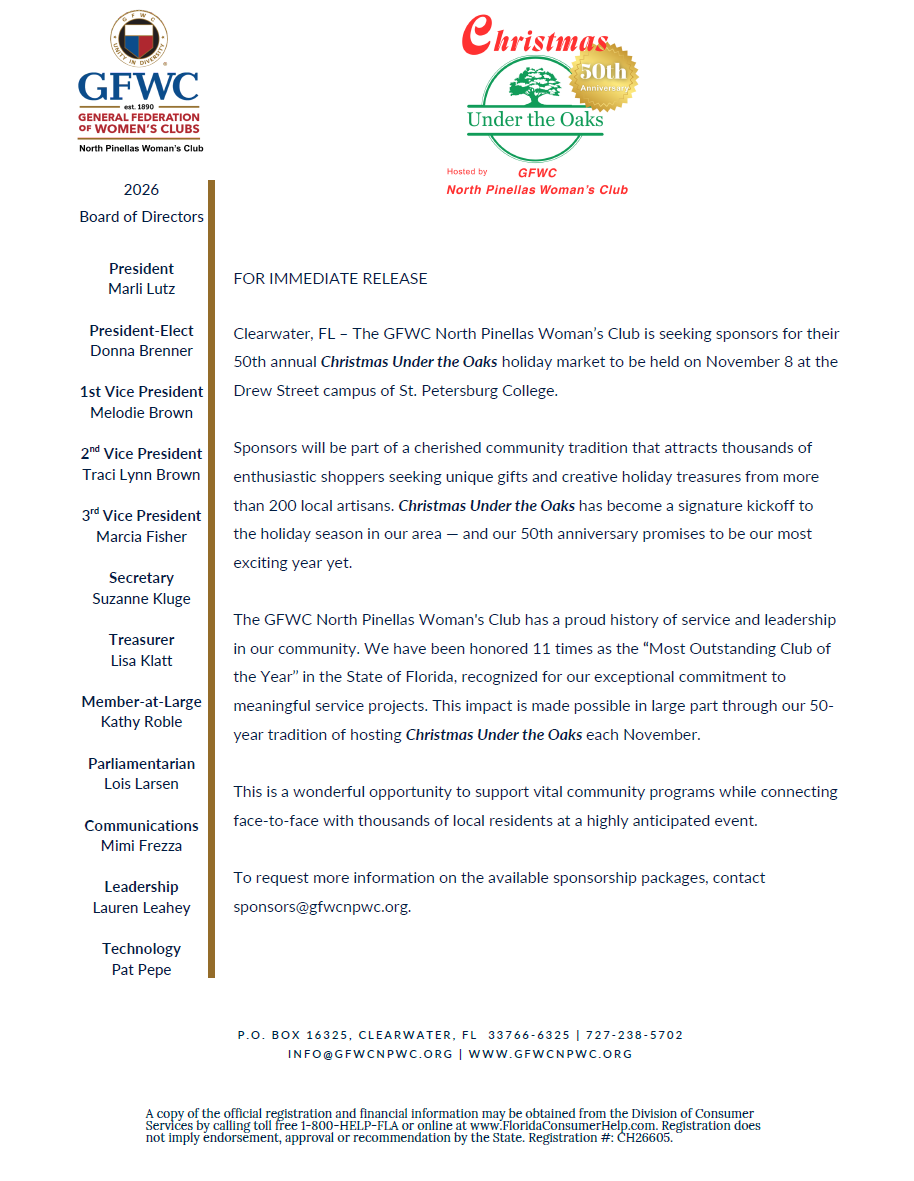 GFWC North Pinellas Woman's Club Christmas Under The Oaks Sponsorships
